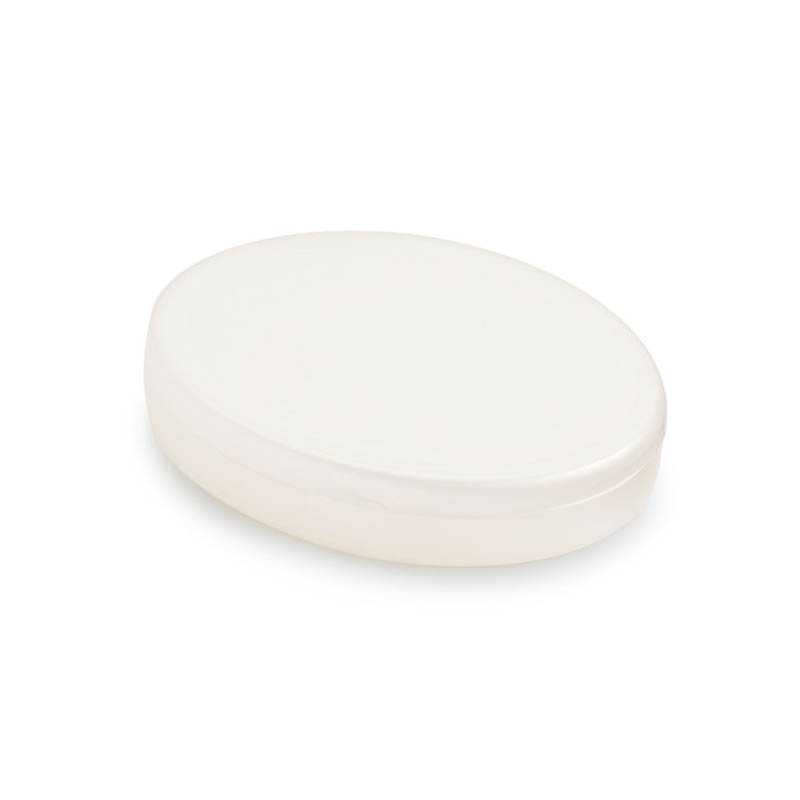 NOVINKA 2025. Pill box in soft and resistant material in white. With 2 inside boxes, safety lock and blade to split pills.