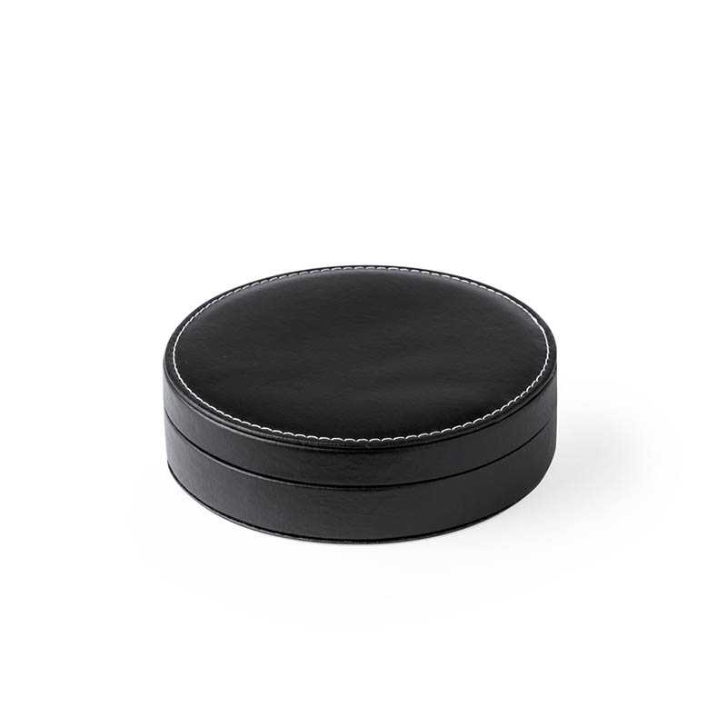 NOVINKA 2025. Wine set with elegant round design finished in PU leather, with stainless steel accessories. Including a 2 lever corkscrew with capsule cutter, a stopper, a doser and a drip stopper.