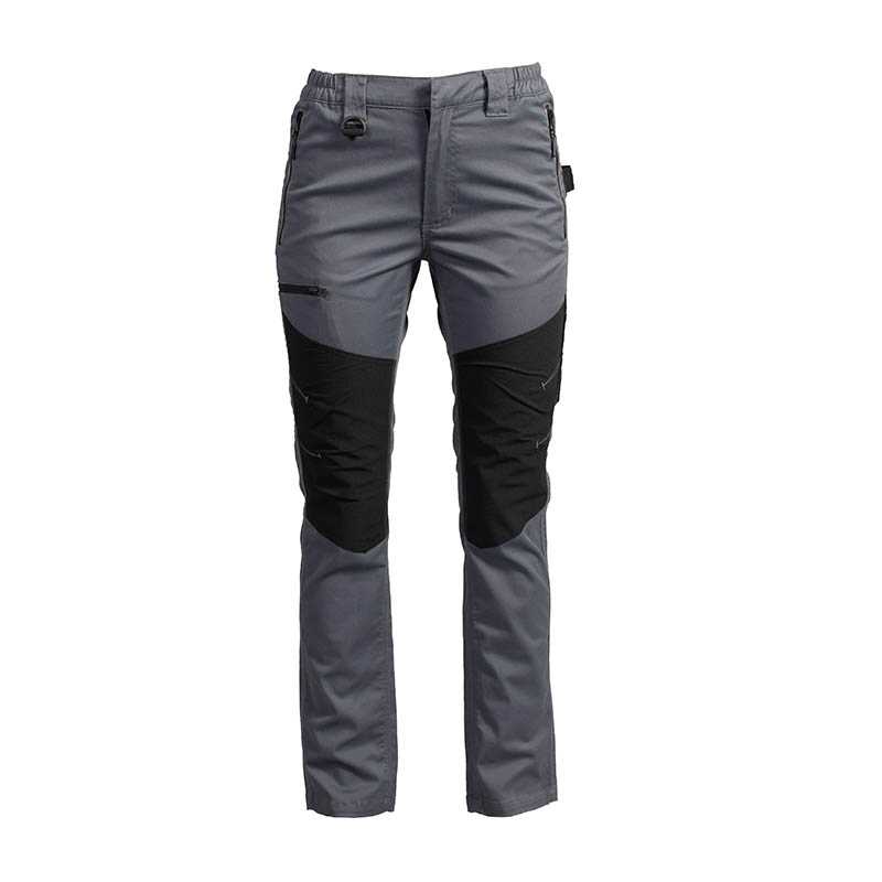 PANT IN STRETCH FABRIC IN HORIZONTAL AND VERTICAL 4 STRETCH - 90% nylon – 10% elastane fabric - Triple stitching - Two front pockets - One side pocket with velcro, one small open pocket and a tool loop - One rear zip pocket with reflective tape - One rear side pocket for ruler or tool holder, with reflective band - Stretch anti-abrasion fabric 92% polyester – 8% elastane on the knees with reflective stitching - Elastic waist with increased loops - Covered snap button at waist