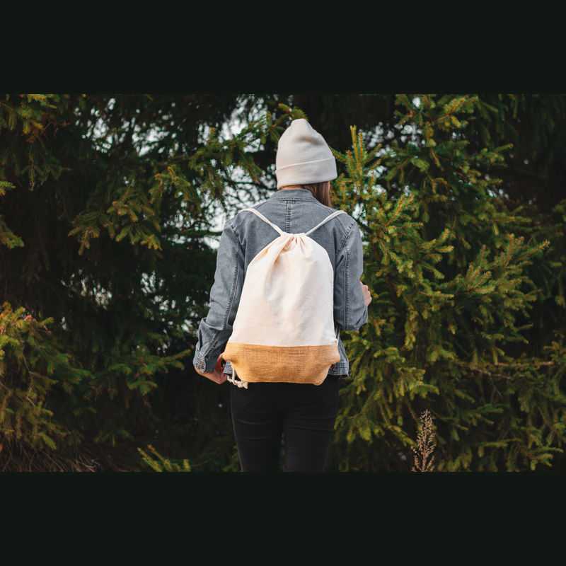 Bavlněná sportovní kapsa doplněné jutovým materiálem, se stahovací šnůrkou, díky které je možné jej použí a jako batoh.