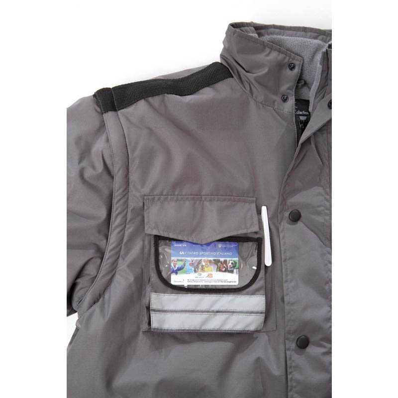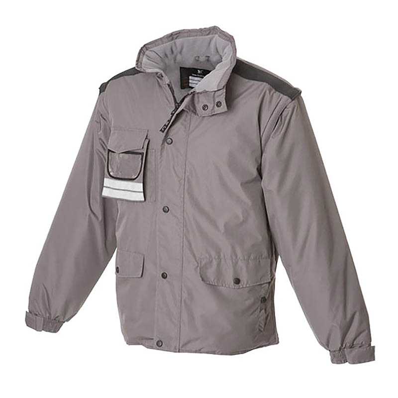 Front zip with cover flap Cover flap with snap buttons Hidden hood inside collar adjustable with stopper Detachable sleeves Ribbed cuffs, inner collar and waistband Seven pockets: 2 low