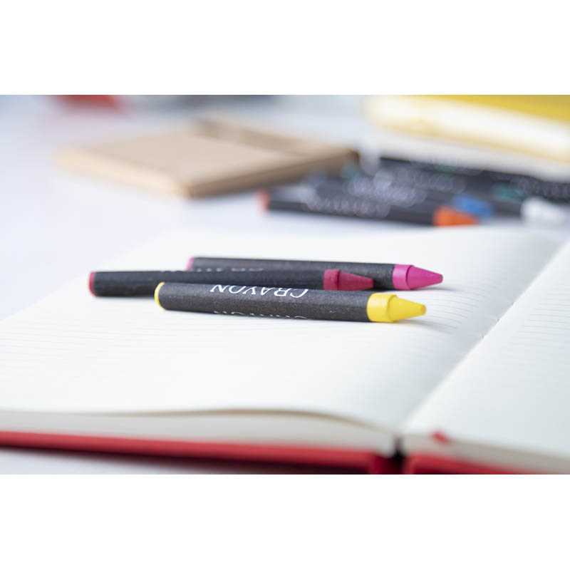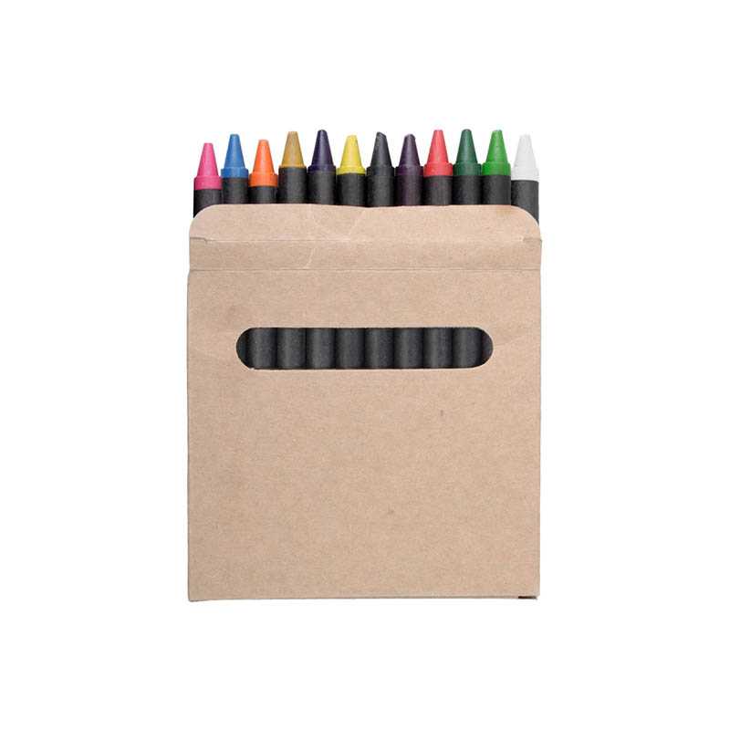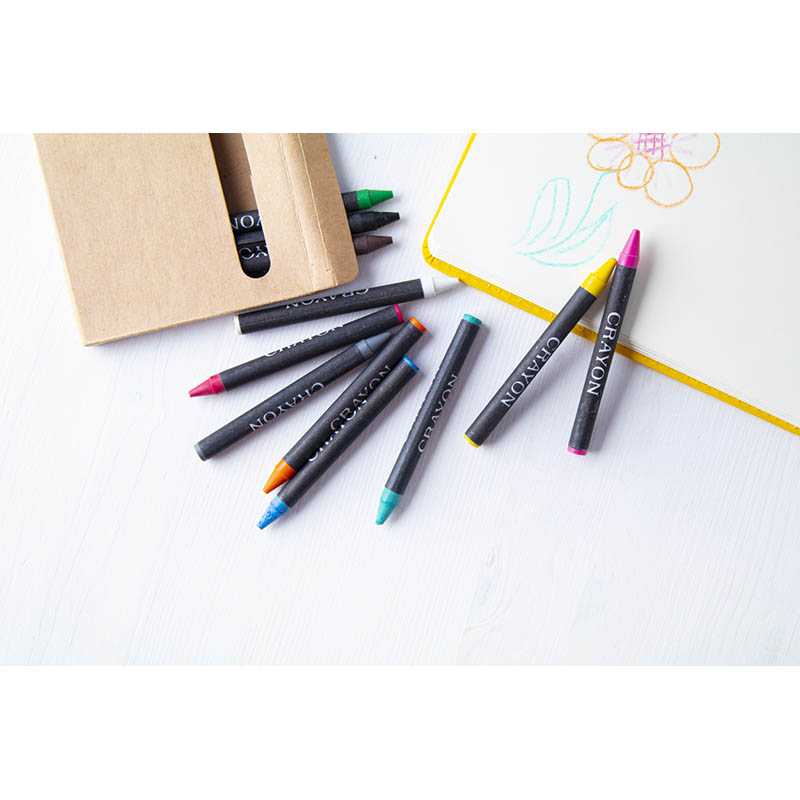 NOVINKA 2025. Set of 13 pieces in a cylindrical box of natural cardboard. Includes 6 wooden pencils with hexagonal body of natural finish and mines in varied colors, pencil sharpener in yellow color and 6 crayons of cylindrical body in a varied range of bright tones.