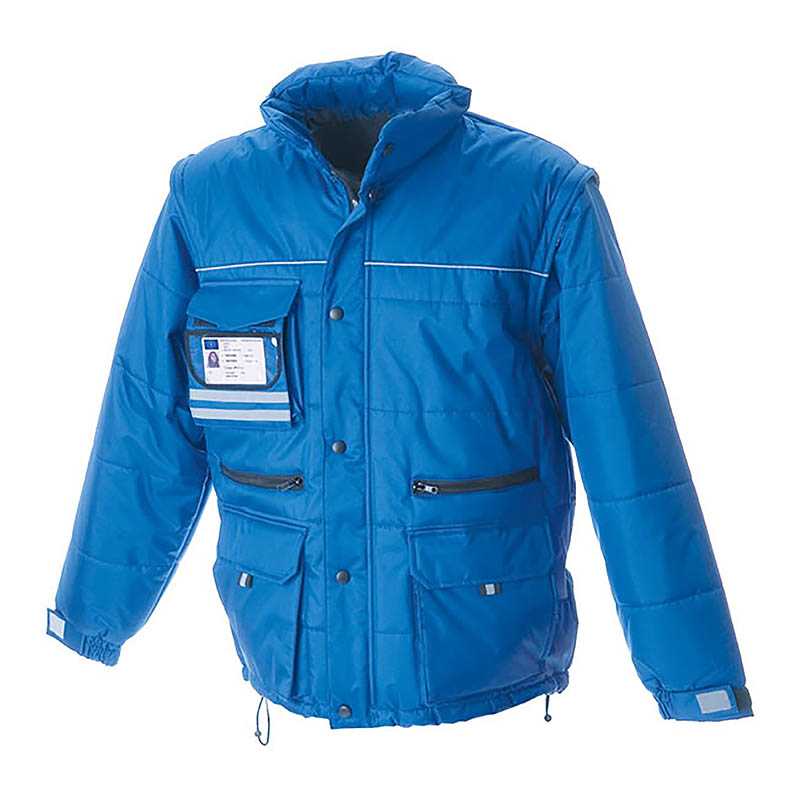 "Jacket in polyester pongee - PVC-coated - Polyester padding - Detachable sleeves - Polyester lining - Pull-out hood in polyester pongee - Reflective thin band - Chest pocket with fold-away badge-pocket and mobile holder inside - Two double-pockets with fl"