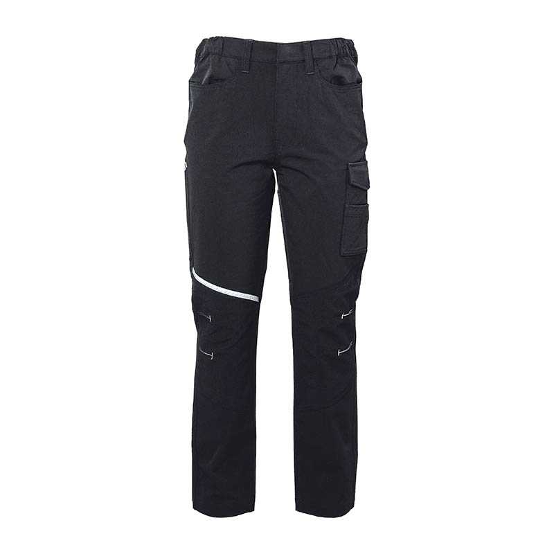 PANT IN STRETCH FABRIC IN HORIZONTAL AND VERTICAL 4 STRETCH - 90% nylon – 10% elastane fabric - Triple stitching - Two front pockets - One side pocket with velcro, one small open pocket and a tool loop - One rear zip pocket with reflective tape - One rear side pocket for ruler or tool holder, with reflective band - Stretch anti-abrasion fabric 92% polyester – 8% elastane on the knees with reflective stitching - Elastic waist with increased loops - Covered snap button at waist
