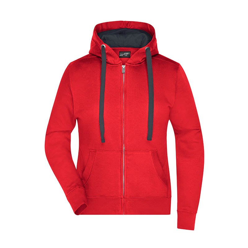 Dámská mikina James & Nicholson s kapucí..Vnější materiál: 100% bavlna.Podšívka: 100% polyester.Zip, šňůrky a vnitřek v kontrastní barvě .Kapuce s ochranou brady .Rukávy a pas s elastanem, klokanní kapsa, ploché švy .Zúžený tvar .Hmotnost: 380 g / m2.Bale