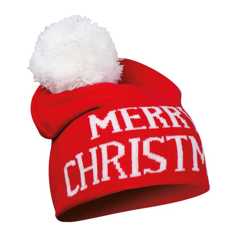 Vianočná čiapka s brmbolcom a nápisom 'Merry Christmas'. Slávnostná a útulná na sviatky.