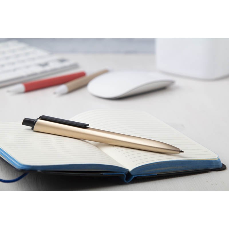 Ekologické kuličkové pero se stiskacím mechanismem, tělem vyrobeným z biologicky odbouratelného papírového materiálu a s doplňky z kukuřičného plastu, dostupné v různých barvách. Barva recyklované lepenky se může různit.