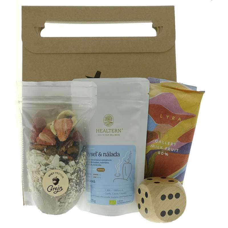 Ovseno-proteínová kaša - Čokoláda, drevená kocka 5 cm, Čokoláda Gallery Milk fruit 80 g, Káva s bylinkami Myseľ & nálada (zrnková) 75g,. Darčeková taška 30x23x10 cm