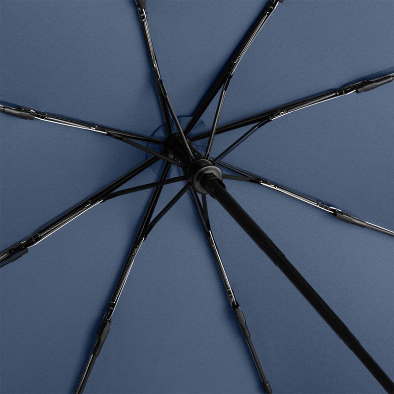 Convenient automatic open/close function for quick opening and closing, high-quality Windproof PLUS system for maximum frame flexibility in stormy conditions, flexible fibreglass ribs, chromed steel shaft, cover with trendy reflective piping in silver, aluminium finished handle with integrated push button and promotional labelling option