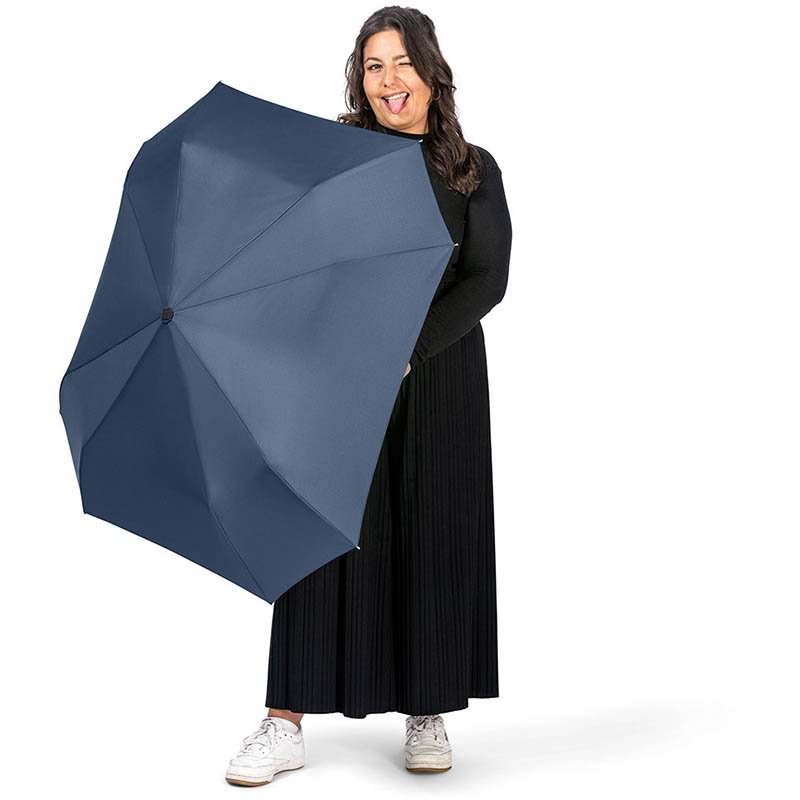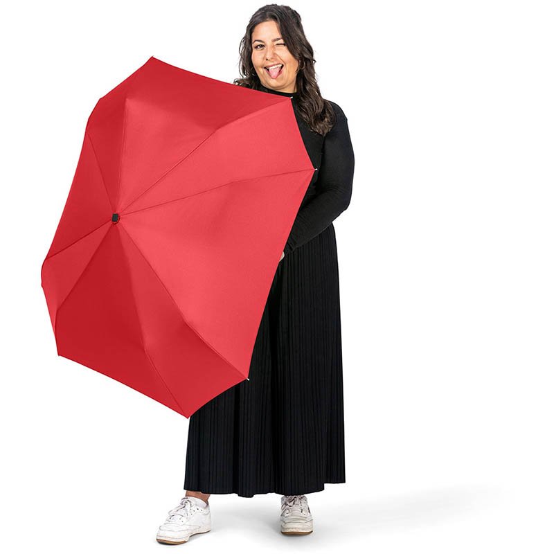 Easy to handle thanks to sliding safety runner, high-quality Windproof PLUS system for maximum frame flexibility in stormy conditions, plastic handle with carrying loop made of cover material colour-coordinated with the cover, special handle with silicone ring to ensure tight closing of the package, tube made of plastic with rubber lip for draining water and for the safe transport of the wet umbrella