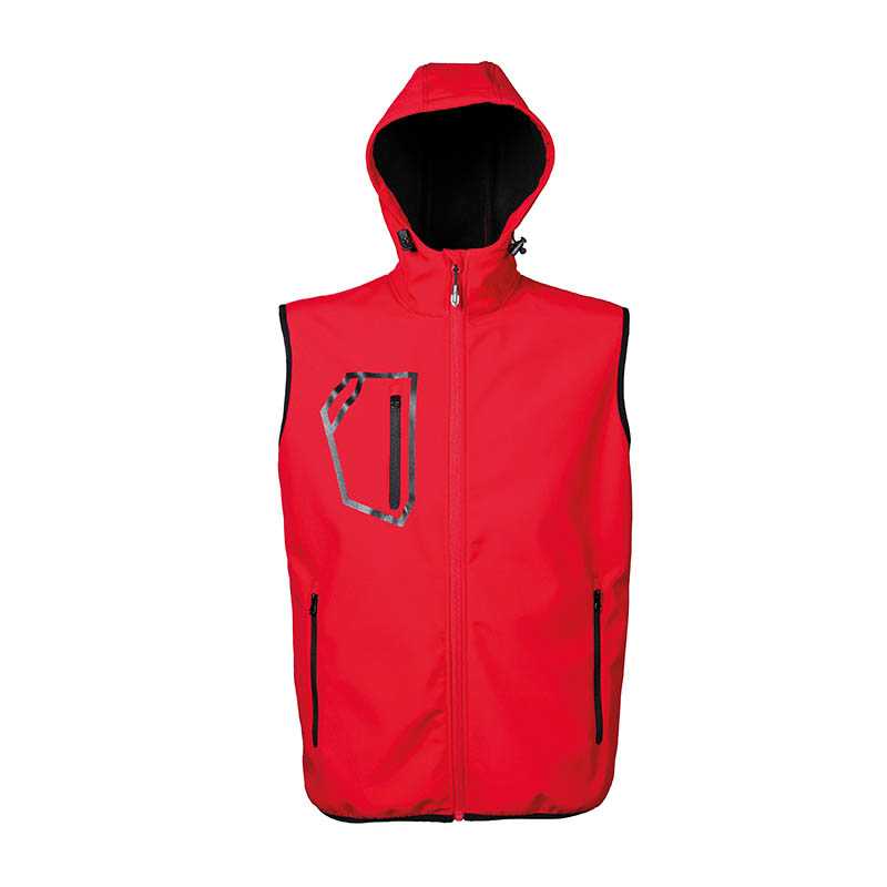 Soft shell waistcoat 2 layer waterproof - 96% polyester – 4% elastan - Waterproof 6000 mm/H2O - Reflective printing on shoulders - Hood with coulisse - One chest pocket with zip - Two pockets with zip - Elasticized fabric on armhole - Elasticized fabric on bottom