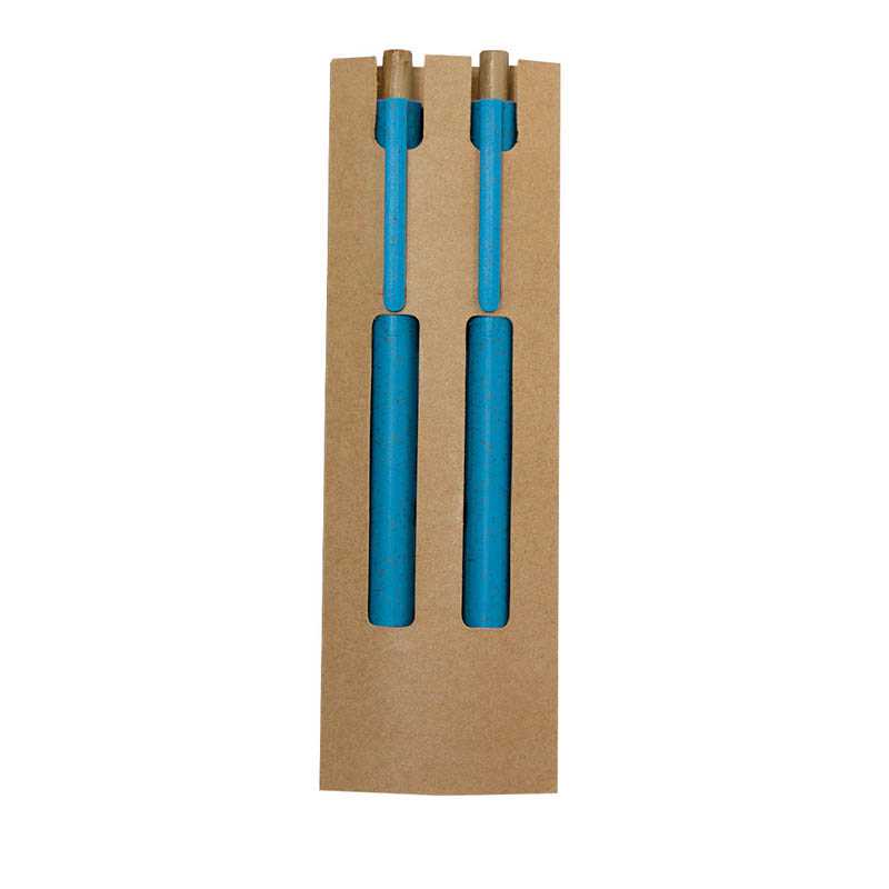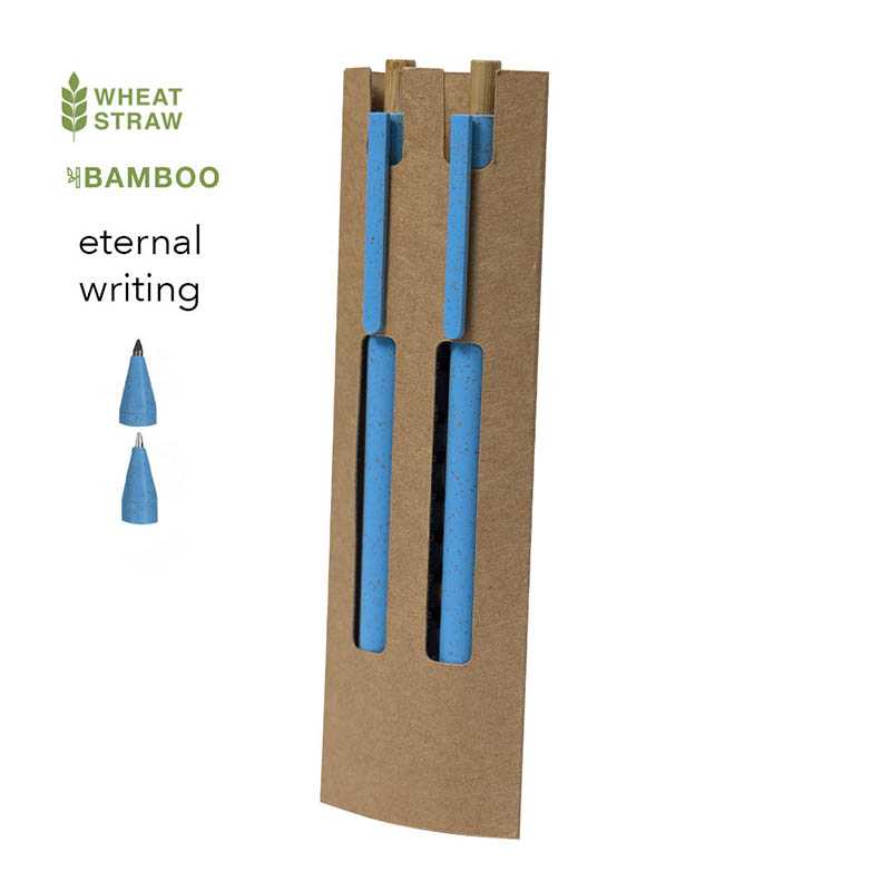 NOVINKA 2025. Ball pen and mechanical pencil set, made of wheat straw. Ball pen in blue ink and mechanical pencil including 2 leads of 0,7mm. Presented in an individual recycled cardboard box. With Wheat Straw logo.Wheat straw promotes the use of natural raw materials, thus reducing pollutant emissions.