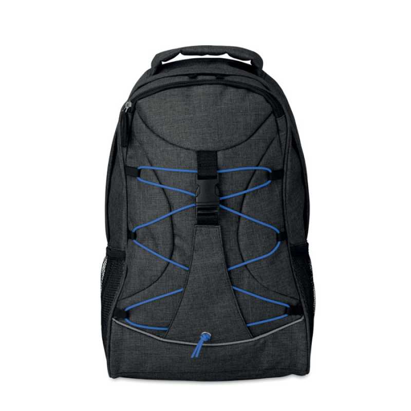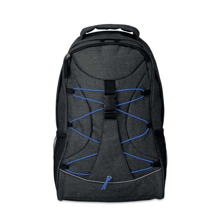 Batoh z 600D dvoubarevného polyesteru s barevnými kontrastními světélkujícími šňůrkami na předním panelu. Síťované kapsy na obou bocích.