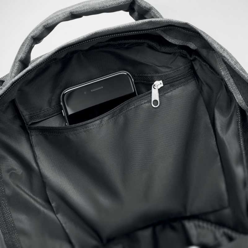 Batoh RPET s hlavní přihrádkou na zip a přední kapsou, polstrovanou přihrádkou na notebook (15") a tablet (10"), bočními popruhy a kapsami na přezky, polstrovaná záda a ramenní popruhy. 600D RPET polyester s výrazným štítkem RPET.