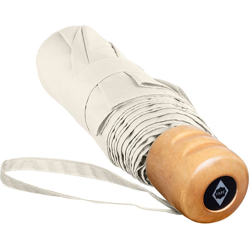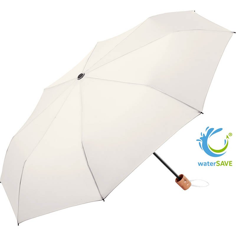 Easy to handle thanks to sliding safety runner, high-quality Windproof PLUS system for maximum frame flexibility in stormy conditions, polyester Pongee waterSAVE® cover material made of recycled plastics and dyed using a water-saving process, with waterSAVE® label on the closing strap (with new deliveries), wooden handle with promotional labelling option, sleeve with zipper can be used as a reusable shopping bag with compartment for the umbrella