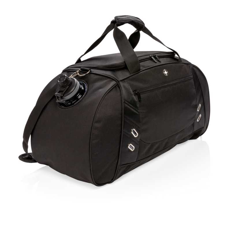 Moderní sportovní taška Swiss Peak je ideálním společníkem na sport, do posilovny nebo na několikadenní výlety. Prostorný hlavní oddíl s širokým otevíráním pro praktickou organizaci obsahu. Přední kapsa na zip, 2 vnější síťové kapsy. Popruhy umožňují rozlišné způsoby nošení. Vnější i vnitřní části jsou vyrobeny ze 100 % recyklovaného polyesteru. Včetně skenovatelné složky AWARE™ garantující obsah recyklátu. Na výrobu bylo využito 31,5 500ml PET lahví. Z výtěžku každého prodaného produktu z kolekce Impact je navíc přispěno 2 % na podporu iniciativy Water.org.