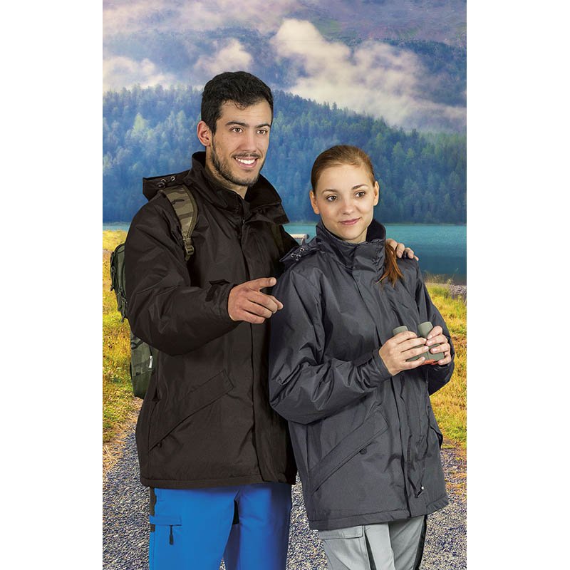 Waterproof Parka with Pockets.Made of outer waterproof flat weave, smooth inner lining and inner quilting for ensuring excellent thermal insulation. Stand-up collar with full-zip velcro flap front closure, for warmth and comfort. Hidden hood that can be easily opened and closed by velcro closure and also can be used as a raincoat. Two slanted zippered waist pockets and an inner left chest velcro pocket for a secure and convenient storage.Includes an inside back zip for easy marking with different methods: screen printing, embroidery, transfer printing, shields, vinyl application. Ideal as promotional clothing, workwear and outdoor activities.