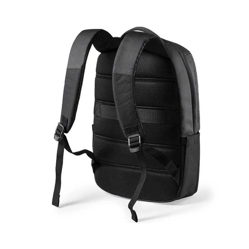 RPET polyester (300D) anti-theft laptop backpack (15 inch). Watted backing. Two compartments inside.