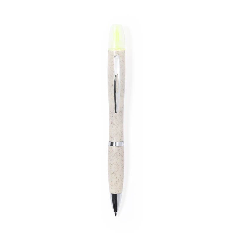 NOVINKA 2025. Practical ball pen made of wheat straw and ABS, with marker included. Twist mechanism and blue ink. The top of the pen includes a useful yellow highlighter with hood. Wheat Straw logo on top of the ball pen, with metal clip and fittings, and a natural coloured barrel.Wheat straw promotes the use of natural raw materials, thus reducing pollutant emissions.
