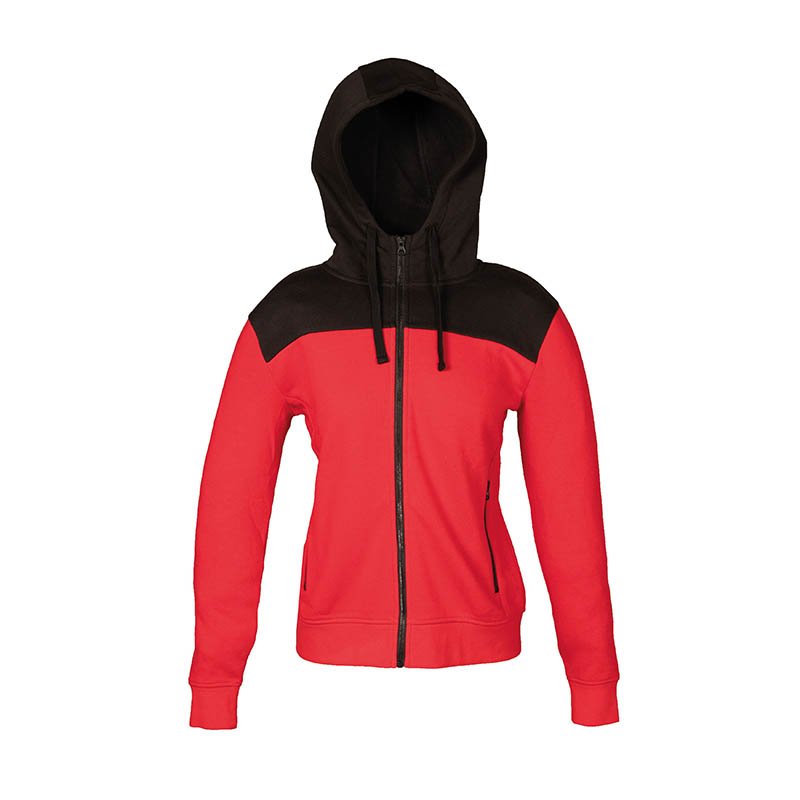 hladký strečový rychleschnoucí materiál, ideální pro sport a pohybové aktivity, střih tvarovaný bočními díly, celopropínací reverzní spirálový zip, kapuce s krytkou brady, vnitřní průkrčník začištěn páskou, raglánové rukávy, kapsy na zip, lemování elastic