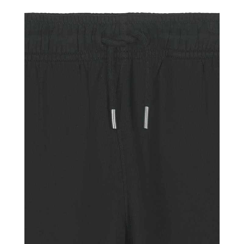 Self fabric elasticated grown on waistband Round drawcords in matching body colour with metal tipping Buttonhole drawcord exit eyelets Inserted side seam pockets Pocket bags in self fabric and single jersey Back panel Welt pocket 1x1 rib at bottom leg