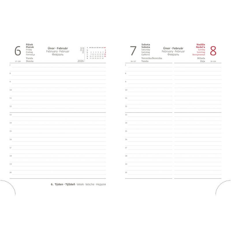 Nová, cenově dostupná řada diářů s obálkou z ekologického papíru spojuje styl a udržitelnost. Denní rozložení s česko-slovenským kalendáriem a doplňkovou angličtinou, němčinou, maďarštinou a ruštinou. • kalendárium od prosince 2025• měsíční p