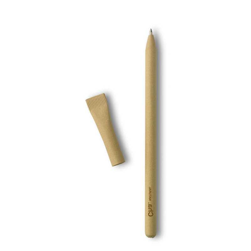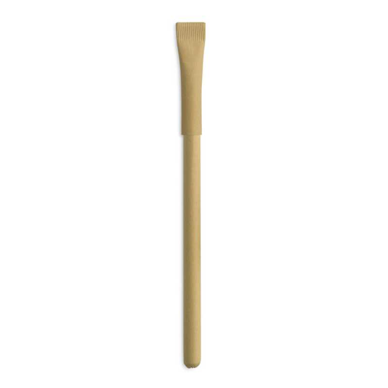 Cardboard ballpen with wooden clip and plastic parts. Blue ink.