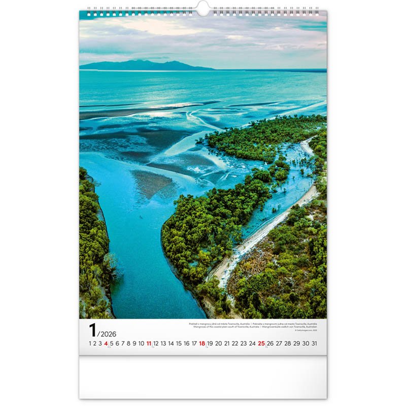 Kalendář World from Above. Formát kalendáře: 31,5 x 45 cm. Kalendárium: měsíční mezinárodní. Rozsah kalendáře: 14 listů. Vazba: Twin-wire (se spirálou). Prostor pro přítisk: 31,5 x 7 cm