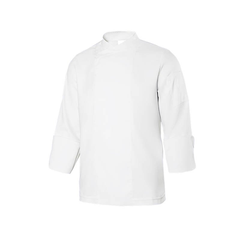 Liquid repellent fabric with antibacterial treatment Asymmetrical front closure with hidden automatic buttons Neckband collar Back fashioned with Coolmax breathable fabric, one-piece Tai
