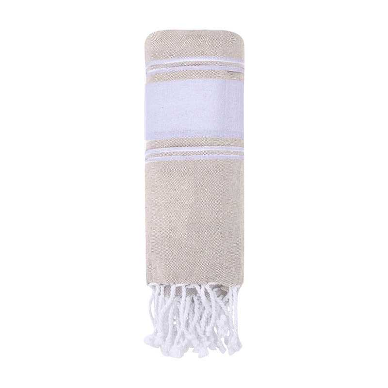 NOVINKA 2025. Large beach/sauna towel SUN & STEAM: large towel with white stripes and fringes, in colour-matching bag with drawstring