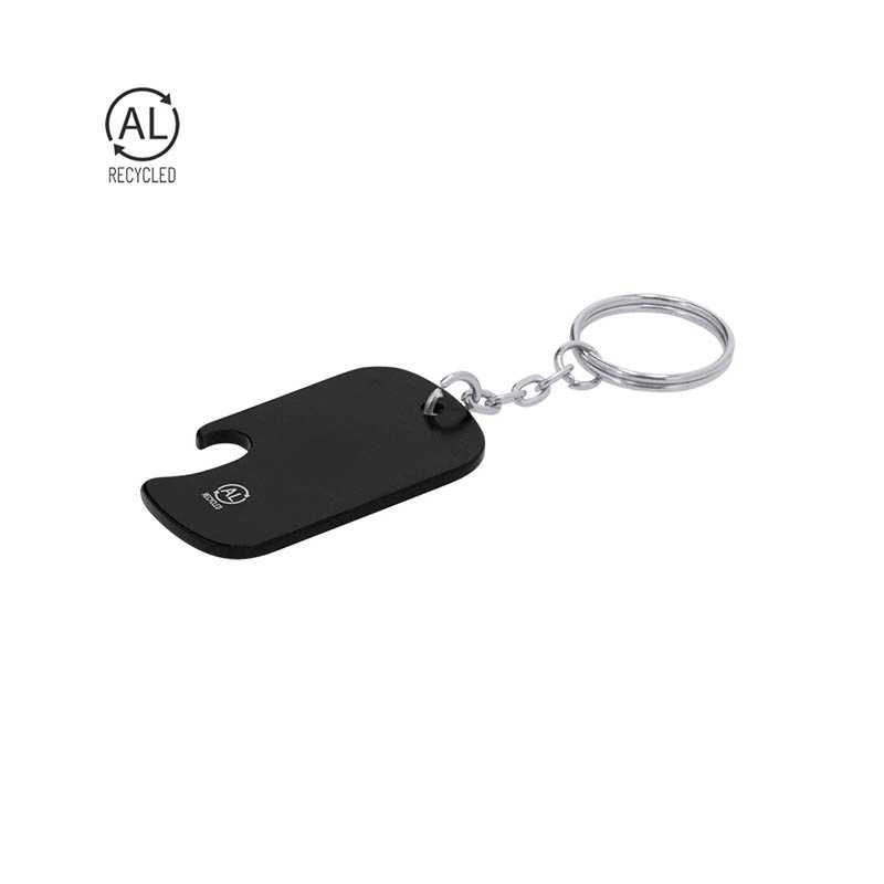 NOVINKA 2025. Keychain opener made of recycled aluminum. Includes recycled aluminum label. Recycled aluminum is a material with almost infinite recycling possibilities, retaining its original properties while consuming less energy in the process. GRS certification (Global Recycled Standard), which guarantees the recycled origin of the material used to manufacture the product.