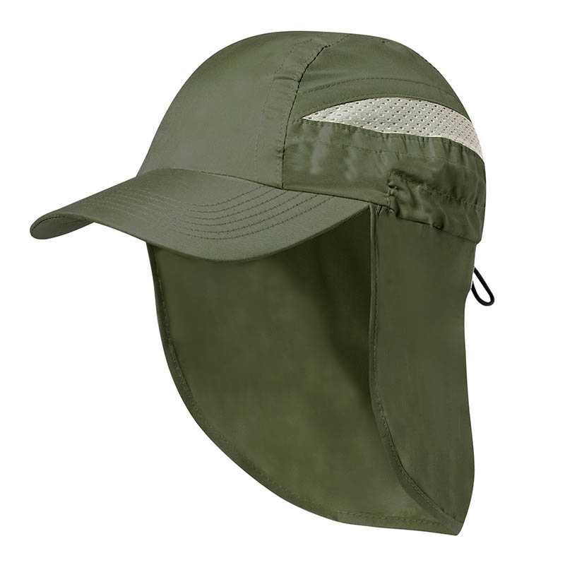 NOVINKA 2025. Sporty in soft microfibre with two-tone design and in bright colours. Elastic band fastening with adjustment accessory and mesh panels for transpiration. Including a flap to protect the neck from the sun.
