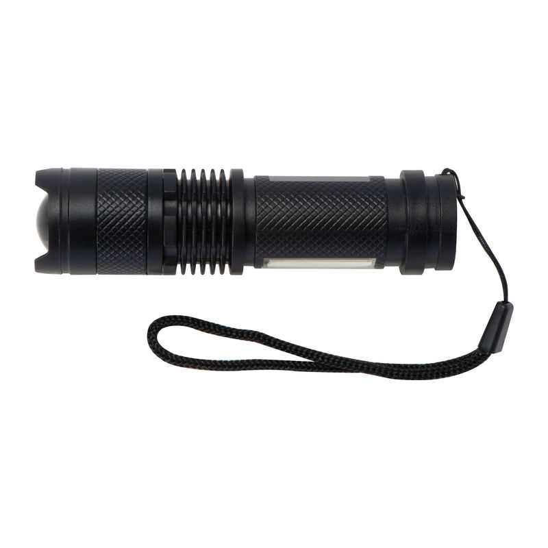 Hliníková baterka s vestavěnou USB dobíjecí baterií (400 mAh) a popruhem na přenášení. Se zoomovatelným vysoce výkonným COB světlem u písma a COB světlometem na boku. S pevným a blikajícím režimem světla. Včetně USB nabíjecího kabelu.