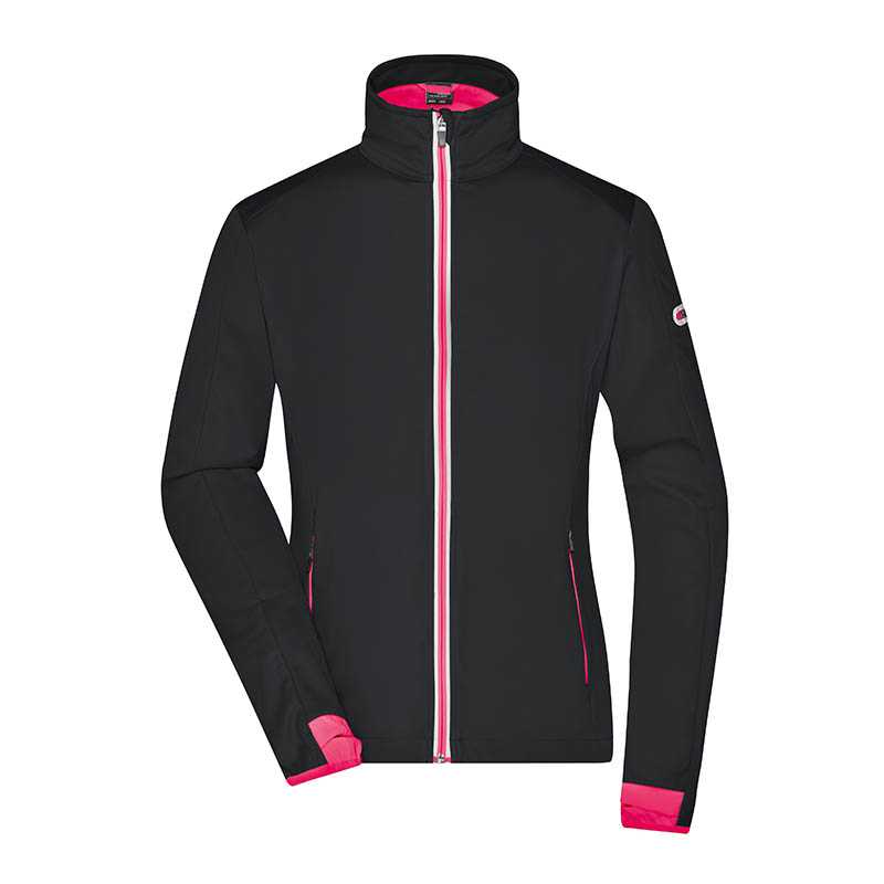 Stylová dámská softshellová bunda James & Nicholson..Vnější materiál: 90% polyester, 10% elastan.Větru a vodě odolná vrstva 3 funkční textilie s PU membránou (2.000 mm vodního sloupce) .Prodyšná (2.000 g / m2 / 24 h) .Měkká, sportovní pružná textilie .2 b