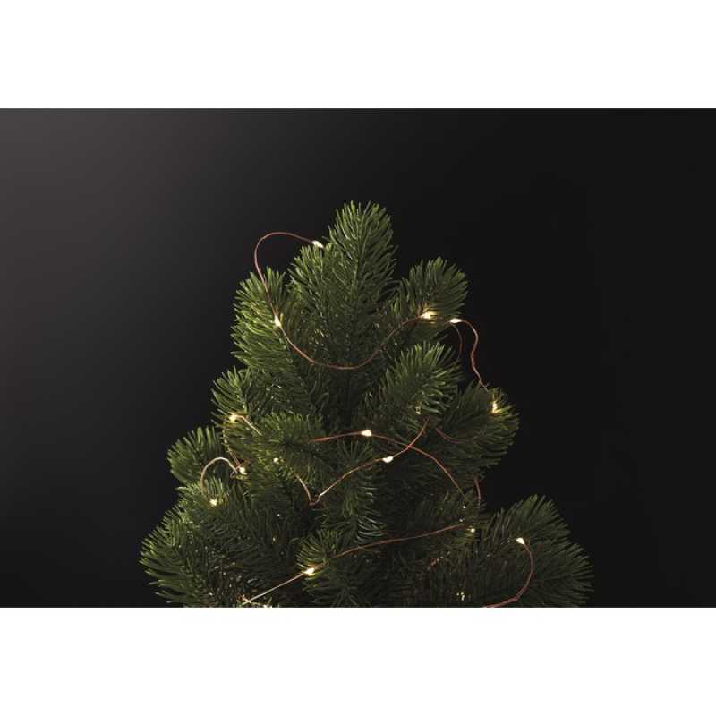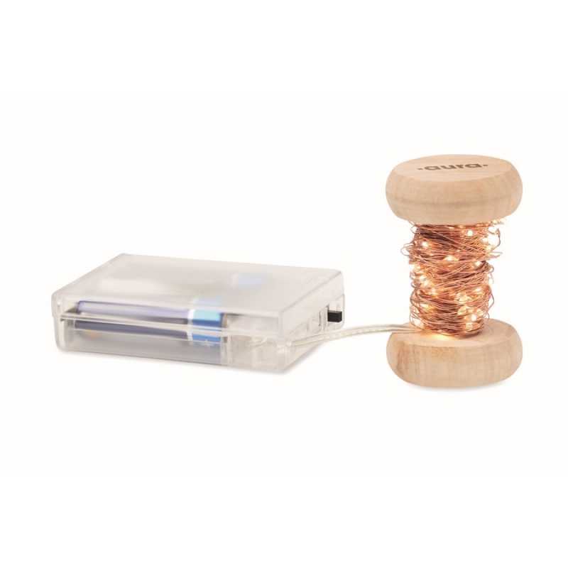 Řetěz s 50 LED pohádkovými světélky s teplým žlutým světlem, na dřevěné cívce. Délka: 5m. Tři baterie AA nejsou součástí balení.