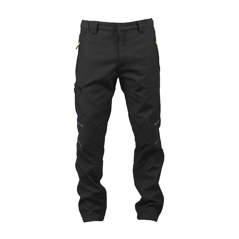 Waterproof 3-layer soft shell pants - 95% polyester - 5% elastane - Waterproof 8000 mm/H2O - Breathability 1000 g/M2/24h - Anti-pilling fleece interior - 92% polyester - 8% elastane reinforcement fabric abrasion resistant on knees and backside - Taped zip - Two zip pockets - A side pocket with zip - A back pocket with zip - Fluo yellow stitching on the knees - Elastic waist and oversized loops - Covered snap button at the waist - No labe