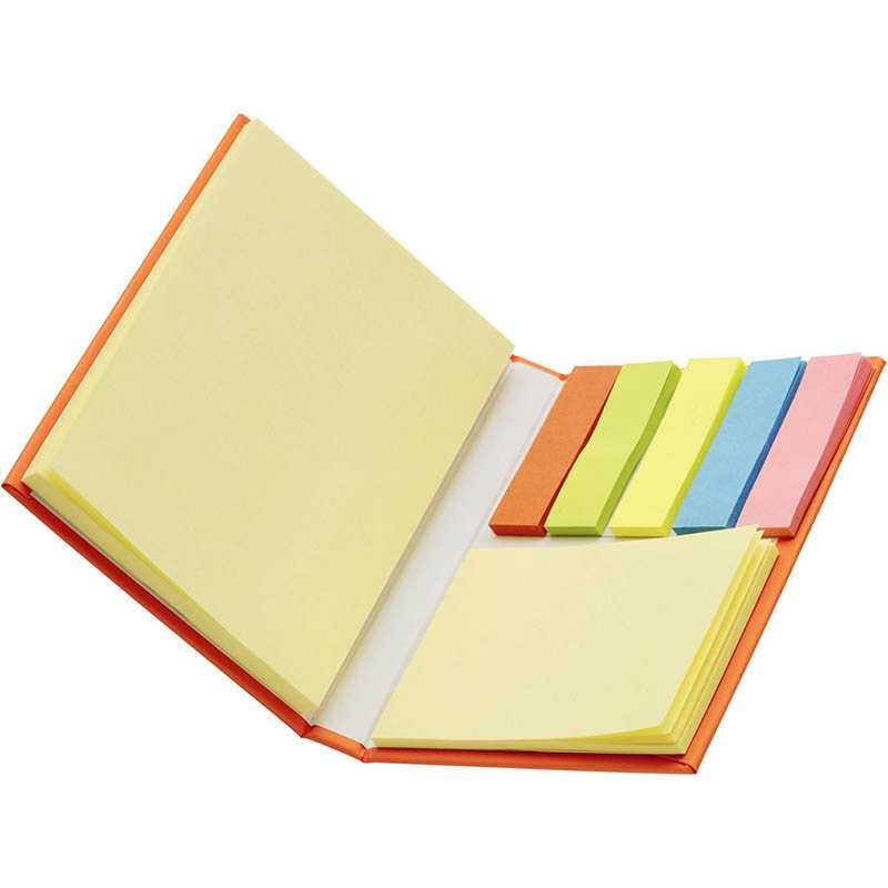 Cardboard booklet with one pad of larger sticky notes, 50 sheets, one pad of medium sticky notes, 25 sheets and 5 colours of small sticky notes, 25 sheets per colour.