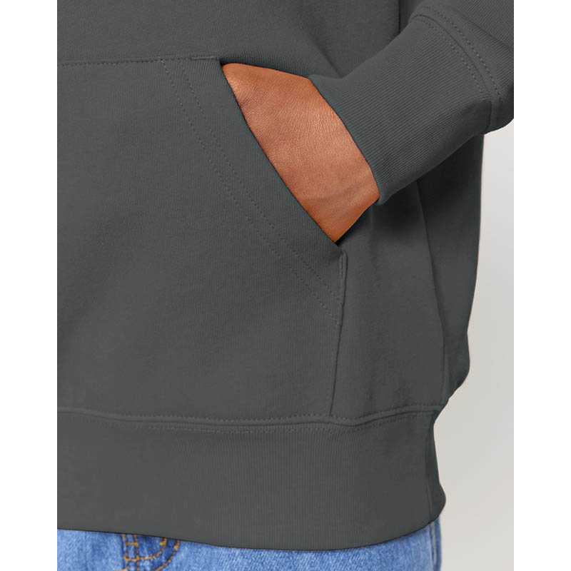 Set-in sleeve Self Fabric lined hood Single jersey tape at inside back neck seam Self fabric half moon at back neck with 3 mm twin needle Single needle topstitch at neckline seam 1x1 rib at sleeve hem and bottom hem 2 needle topstitch centered on sea