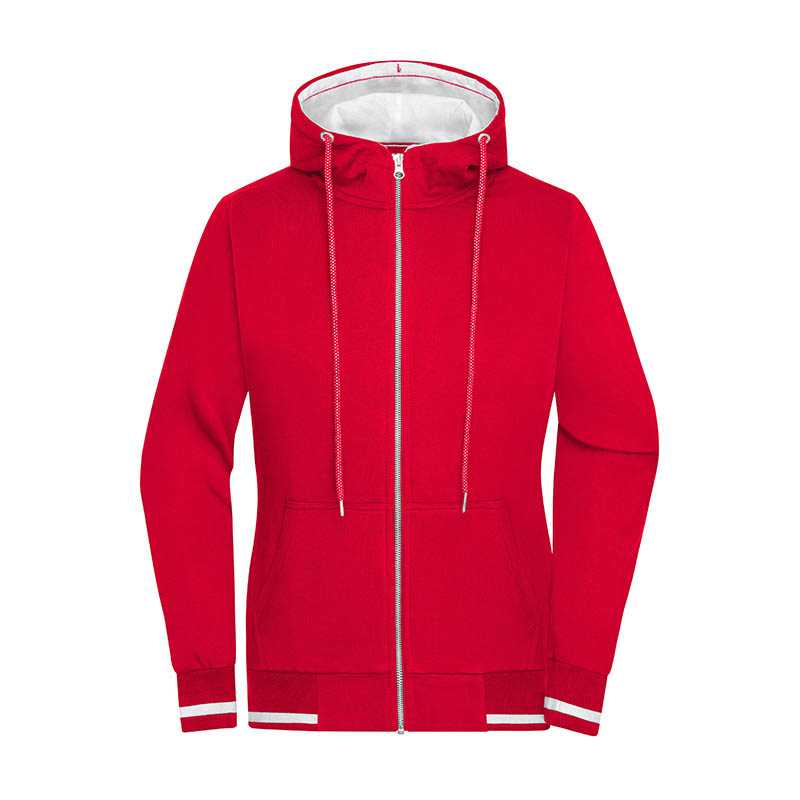 "Lady’s cotton – polyester sweater - Special dry fabric - Lined hood - Full zip with waterproof cover - Raglan sleeves - Two zip-pocket - Contrasting details - Colored tape inside collar - Ribbed cuffs and band at the waist"