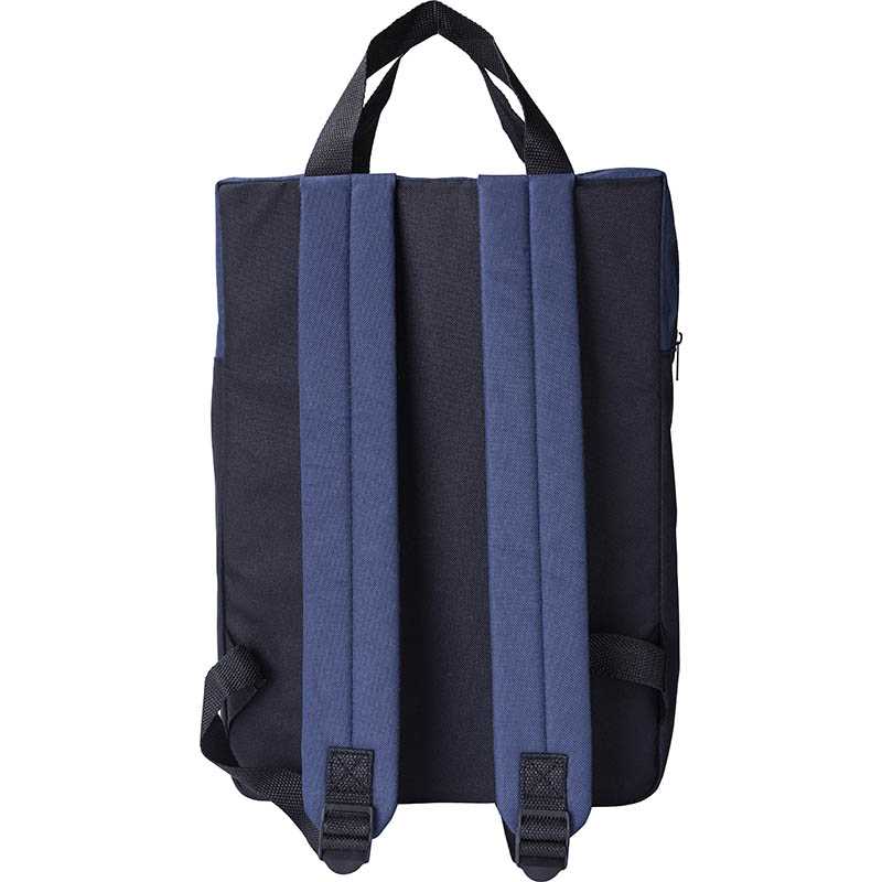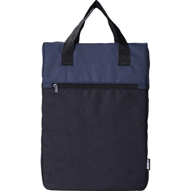 RPET polyester (600D) backpack. One compartment. One zippered front pocket. Colour detail on the top, black on the bottum. Carying handles on the top.