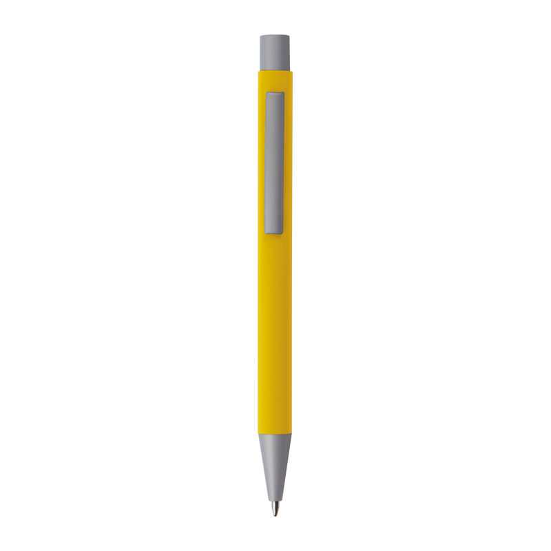 Kovové kuličkové pero s velkou modrou náplní, v různých barvách, se stříbrným klipem. Otisk umístěný pod klipem.