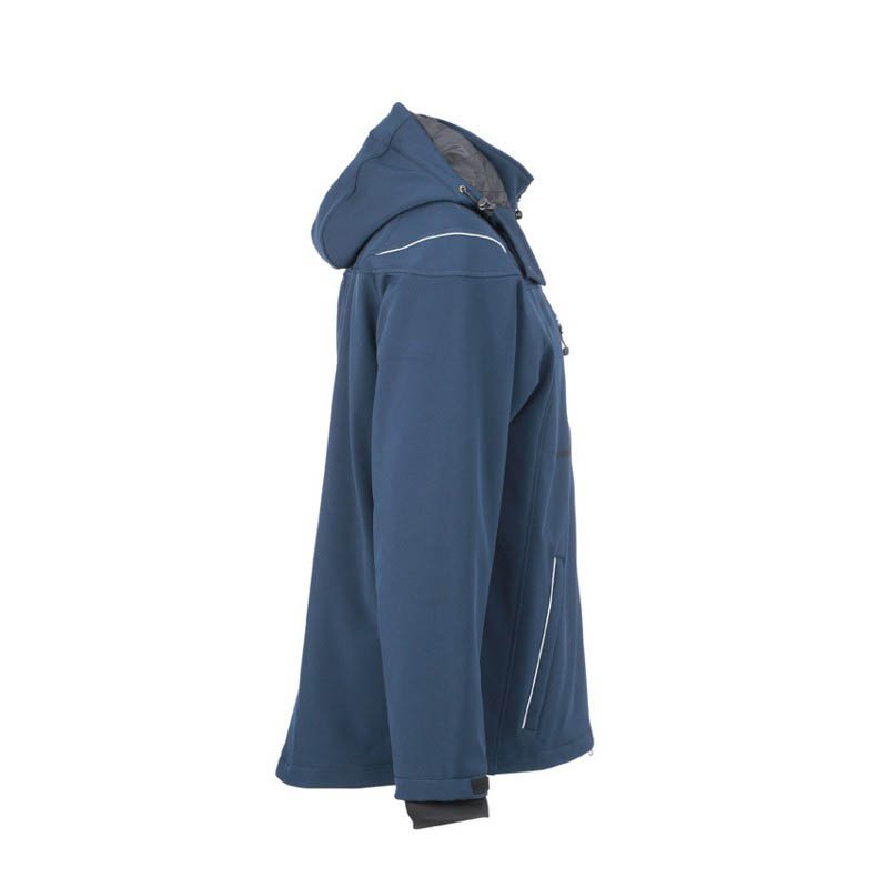 Softshell jacket 3 layers, waterproof and breathable - 97% polyester - 3% elastan - Waterproof 6000 mm/H2O - Breathability 4000 g/M2/24h - Thermic lining inside the front part - Reflective printing on front and back side - Raglan sleeves - Detachable padded-hood with drawstring - Laser cutting zip - One chest pocket with zip - Two pockets with zip - Inner wallet pocket - Elastic cuffs with velcro closing - Drawstring at the bottom