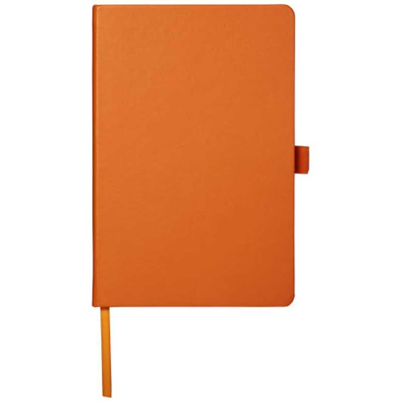 Poznámkový blok s imitací kůže A5 (14,2 cm x 21,4 cm) (koženka) s elastickým páskem, záložkou, smyčkou na pero a skládací zadní kapsou. Obsahuje 96 listů řádkovaných krémových papírů o hmotnosti 70 g/m2 a je nabízen v bílém pouzdru Journalbook.