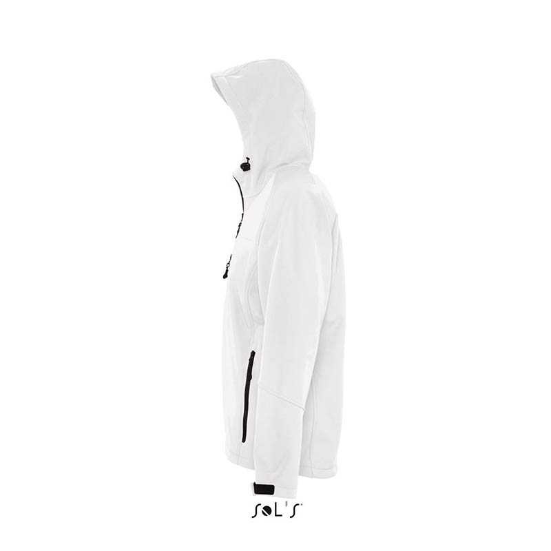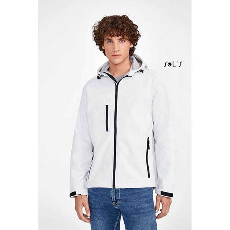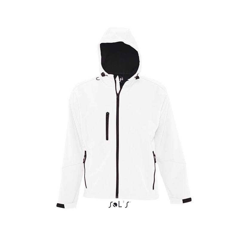 Waterproof 3-layer soft shell jacket - 95% polyester - 5% elastane - Waterproof 8000 mm/H2O - Breathability 1000 g/M2/24h - Raglan sleeves with abrasion resistant fabric on elbows and forearms - Anti-pilling fleece interior - Hood with drawstring - Hood fabric lining perforated - Internal neck reinforcement tape with hanger hook - YKK taped zippers - A chest pocket with zip with reflective taping - Two external pockets with zip - Rear reflective print on the back - Chin protection fabric with reflective print - Adjustable cuffs with velcro - Drawstring at the bottom
