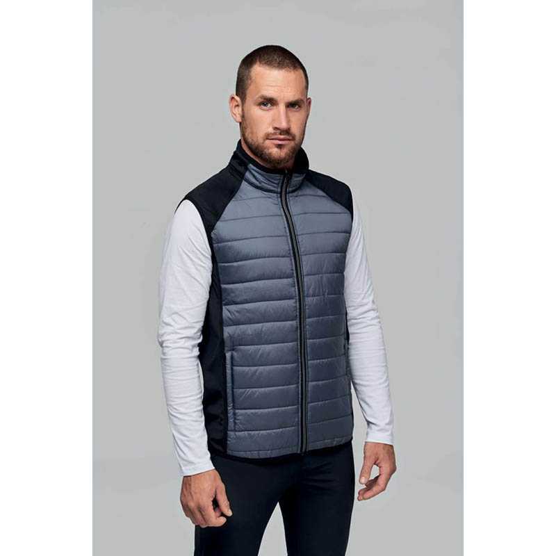 ·Outer: 100% polyester (ripstop) with PVC-coating ·Insulation: 180 gsm, 100% polyester ·Lining: 100% polyester ·Windproof and water repellent ·Stand-up collar ·Quilted body ·Deep armholes with elasticated weather protectors ·Concealed zip with storm flap and press studs ·Patch mobile phone pocket, 3 front pockets with zip, double front pockets with tear release closing flaps, inside pocket ·Longer back panel ·Decoration access: back and left chest pocket·Suitable for embroidery, transfer print. Značka : RESULT . Materiál : Polyester