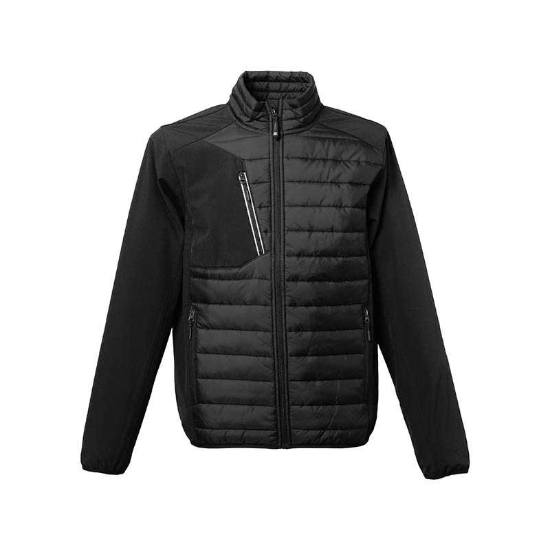 NOVINKA 2025. COMPOSITE FABRIC JACKET - Main fabric in soft 310T nylon with water-repellent treatment. - Polyester padding - Meshed polyester lining on the front and in polyester in the back - Additional fabric on sleeves, shoulders and sides in black 3-layer softshell in 95% polyester - 5% elastane, waterproof 8000mm breathability 1000h; anti-pilling fleece interior - YKK taped zippers - Two external zip pockets - One zipped chest pocket with reflective taping - Reflective piping along the rear side - Internal neck reinforcement tape with coat hanger - Central zip with internal windproof fabric - Chin protection fabric - Elastic fabric at the cuffs and hem
