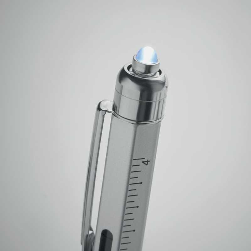 Multifunkční pero s pravítkem (7 cm), vodováhou, šroubovákem, stylusem a kuličkovým perem s modrým inkoustem pro psaní až 400 m textu. Vyrobeno z vysoce kvalitního hliníku.