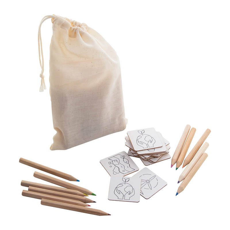 Vybarvovací pexeso v bavlněném pouzdře. Obsahuje tématické papírové pexeso (24 dílků) a dřevěné pastelky (12 ks) v papírové krabičce.