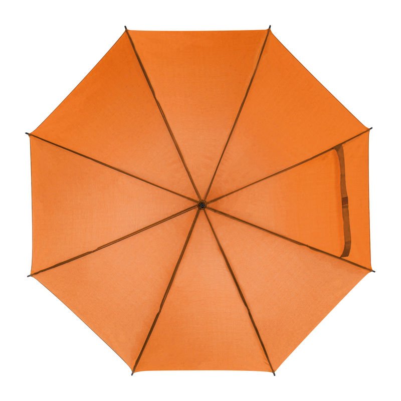 NOVINKA 2025. 8-panel umbrella made of polyester. 105cm in diameter, with manual opening, black metallic ribs and Velcro fastening. Pole and handle in soft wooden natural colour finishing, with fabric available in a wide range of bright colours.