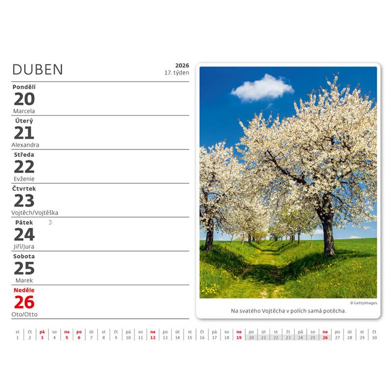 Romantická i málo známá zákoutí Čech a Moravy na stránkách praktického stolního kalendáře, který může posloužit také jako zdroj inspirace pro vaše výlety. Kalendář obsahuje české kalendárium s českými jmény, svátky, významnými dny a přehled na rok 2026 a